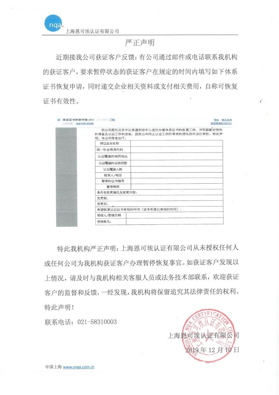 我公司也在此作出声明:上海恩可埃认证有限公司从未授权任何人或任何公司对我机构获证客户办理暂停恢复事宜。如获证客户发现以上情况,请及时与我机构相关客服人员或法务技术部联系,欢迎获证客户的监督和反馈。