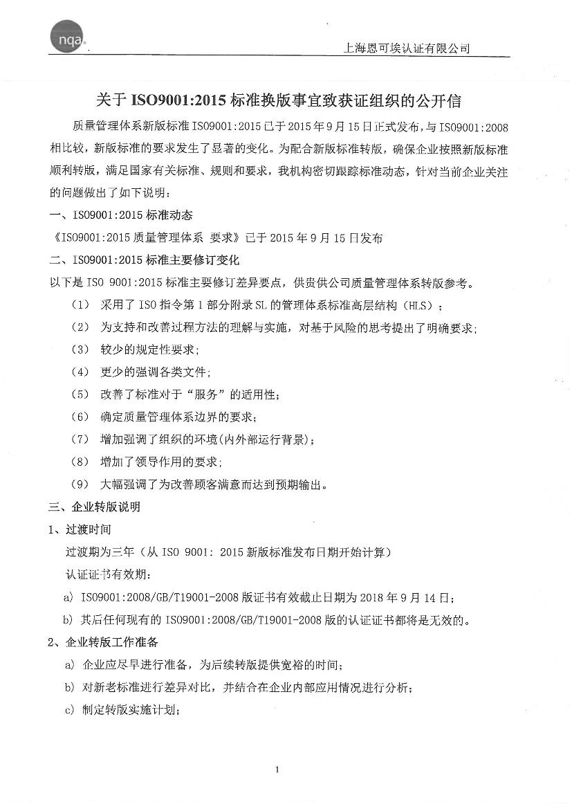 关于ISO9001:2015标准换版事宜致获证组织的公开信